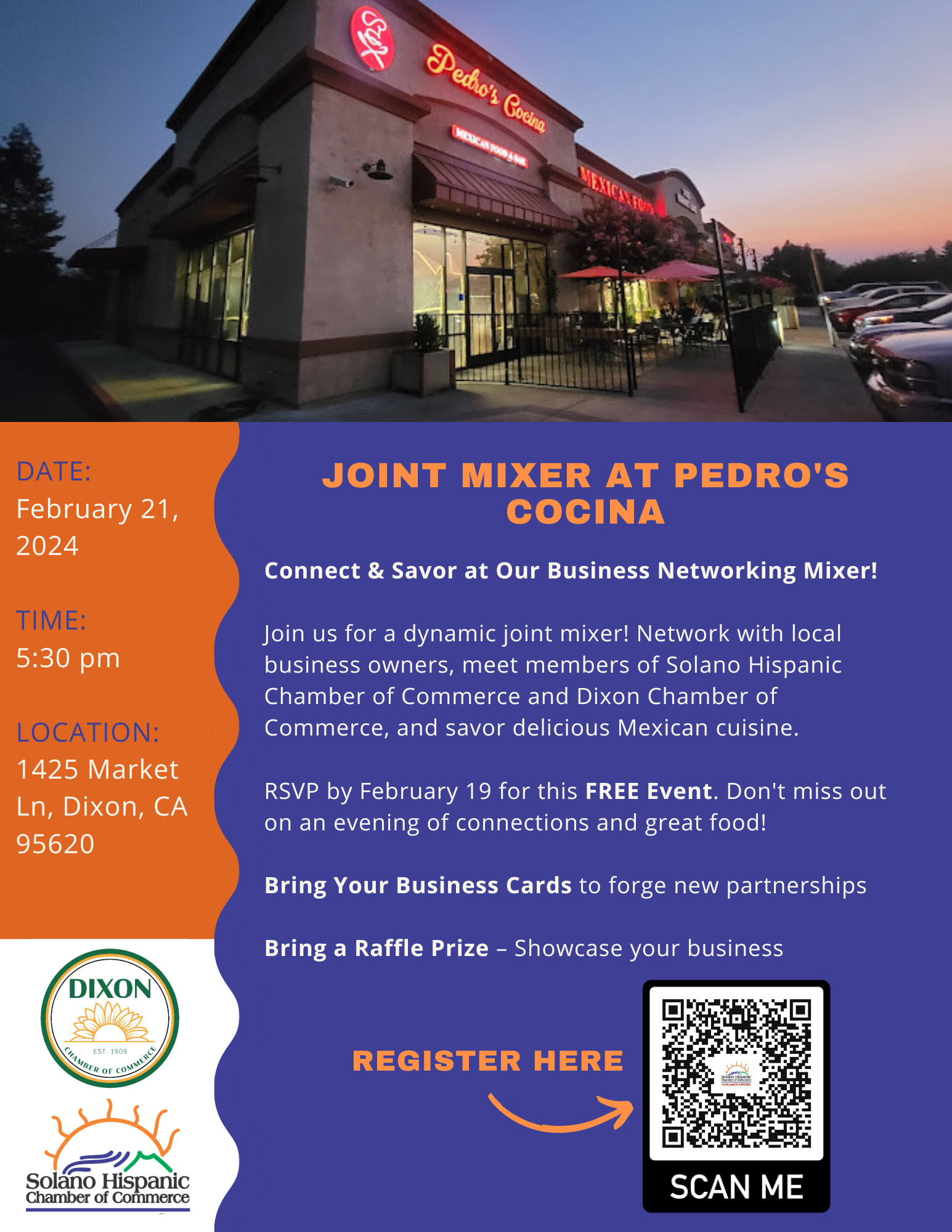 Join us for a dynamic joint mixer! Nework with local business owners, meet members of Solano Hispanic Chamber of Commerce and Dixon Chamber of Commerce, and savor delicious Mexican cuisine.