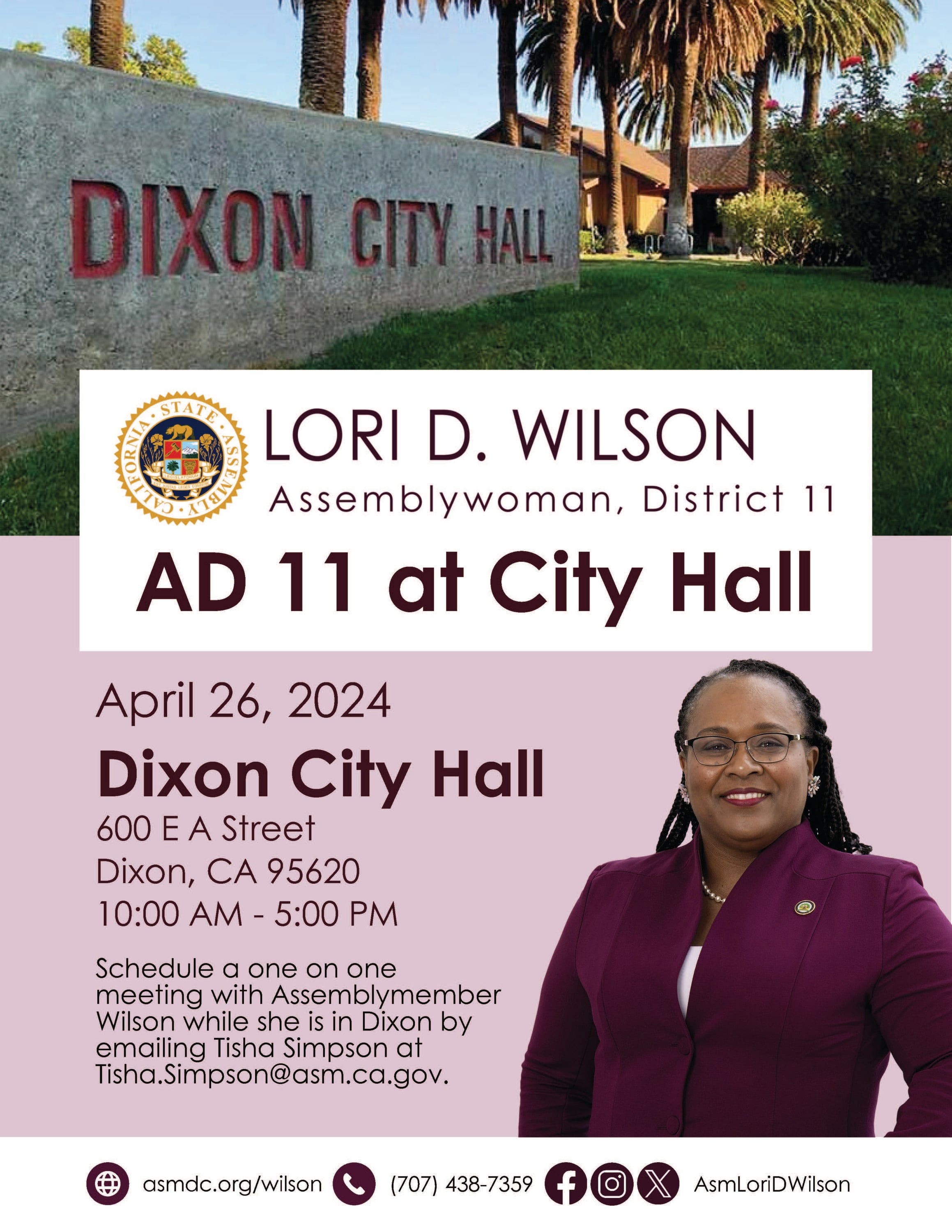 Assemblymember Lori D. Wilson will be at Dixon City Hall!