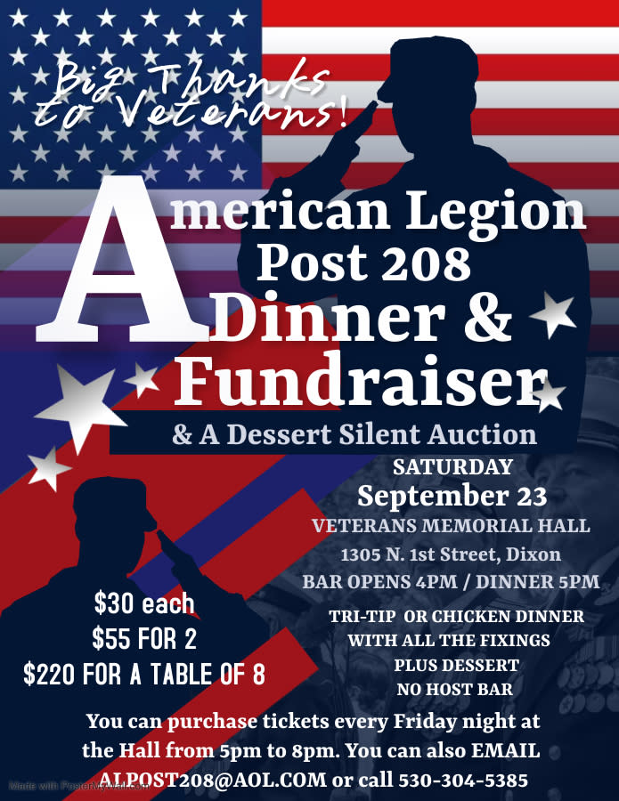 Tickets are $30 each, $55 for 2, or $220 for a table. No-Host Bar opens at4 pm, Dinner at 5 pm Tri-Tip or Chicken Dinner with all the Fixings, plus dessert. Tickets can be purchases every Friday night at the Hall from 5 to 8 pm. You can also send an email to ALPOST208@aol.com, or call 530-304-5385.Images