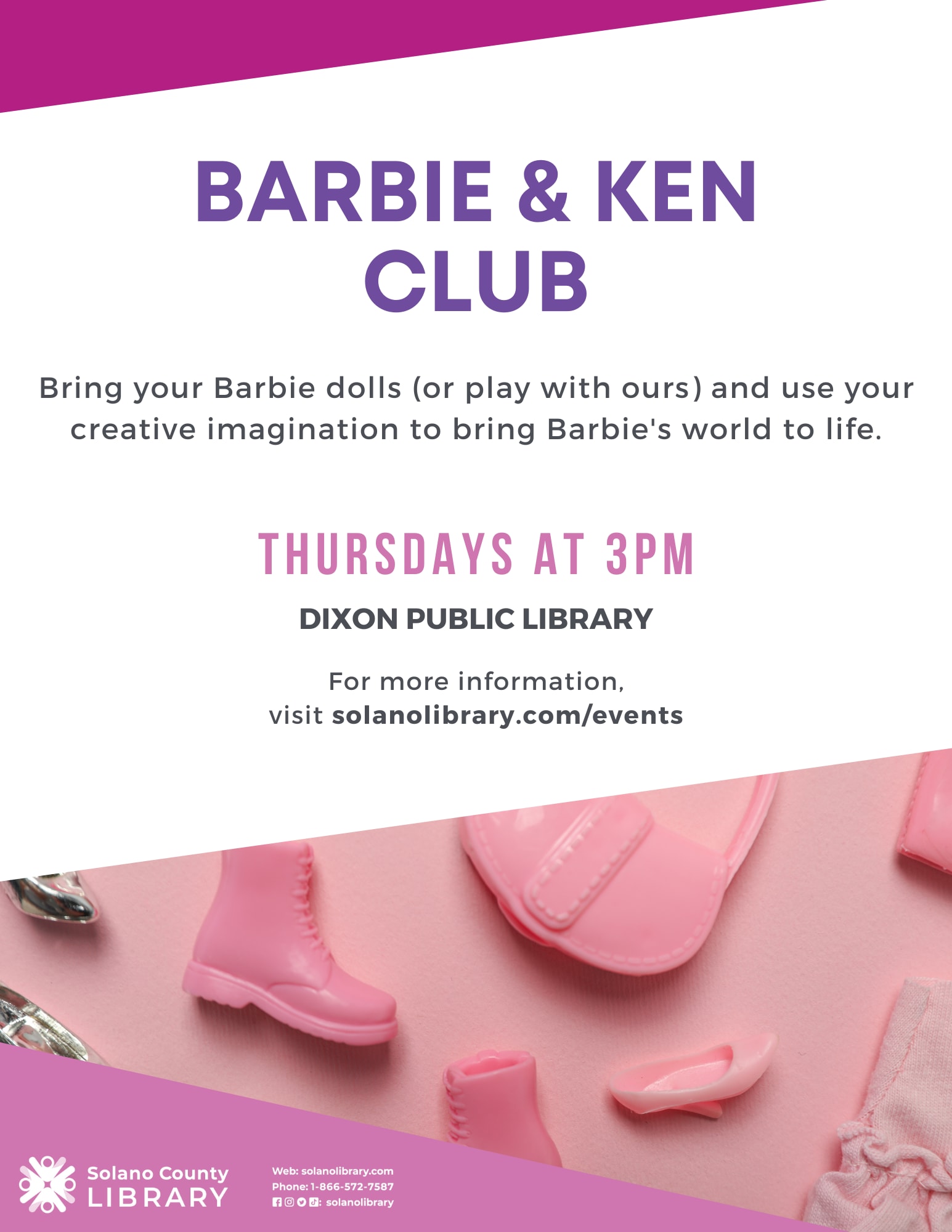 Bring your Barbie dolls (or play with ours) and use your creative imagination to bring Barbie's world to life. For more information visit solanolibrary.com/eventsImages